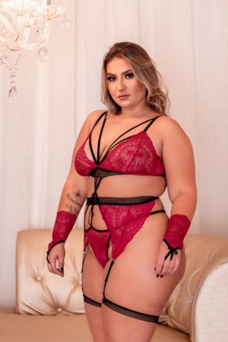 Body sensual sem bojo, sem aro, detalhe de strap no busto e na cintura, o que deixa a peça super sofisticada, detalhe de arrastão na base do sutiã, no cós da calcinha e nas persex. Acompanha cinta liga rendada, par de luvas e par de persex.