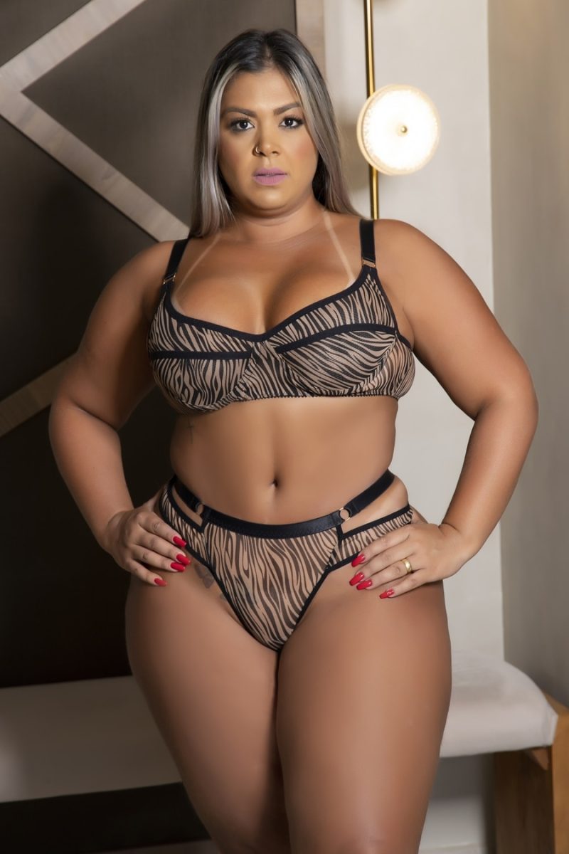 Conjunto sensual plus size estampa animal print sem bojo calcinha sexy com argola
