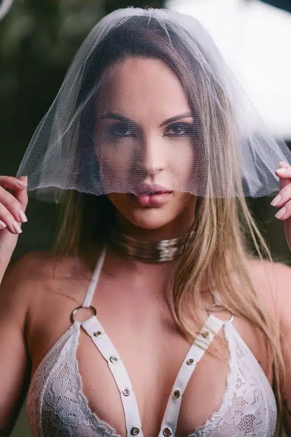 As ligas e a tiara com véu completam o visual com um toque de fetiche que eleva a experiência a outro nível. Esses detalhes únicos criam um universo de possibilidades, tornando a noite mágica e repleta de desejo.