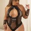 Mude-se para uma mulher policial exigente e mostre ao seu homem que você sabe como acalmar seus pensamentos mais eroticos. Body sensual, feito em arrastão com detalhes em renda, sem bojo, costas toda aberta, fundilho do body com abertura em baixo, acompanha luvas e adesivo na frente.